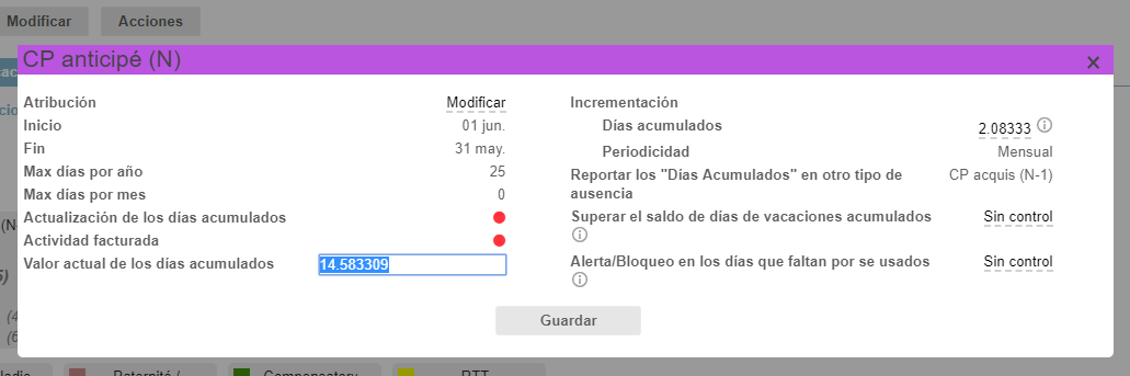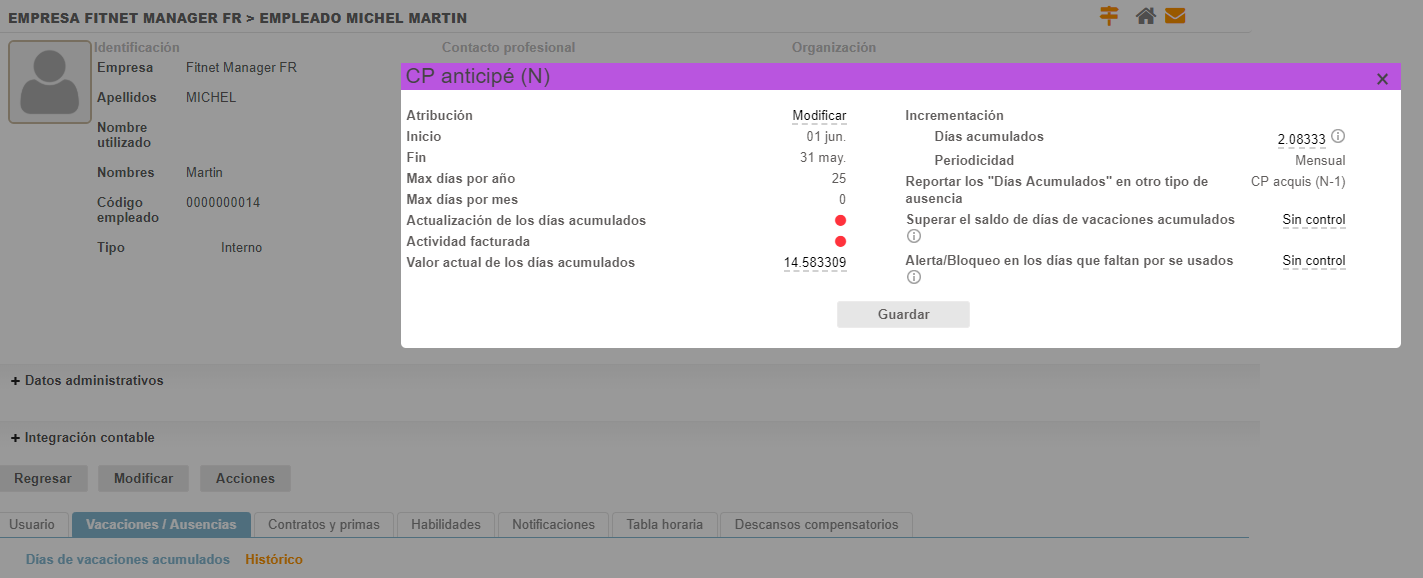 La cantidad de días adquiridos para incrementar cada mes se puede configurar específicamente para cada empleado.