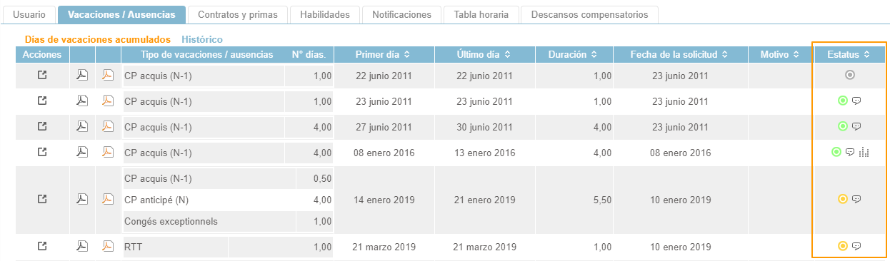 El histórico de solicitudes de vacaciones del empleado y las declaraciones de ausencia se pueden acceder directamente en su ficha de empleado.
