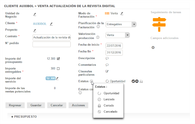 El primer estatus al generar un contrato es Oportunidad. En esta fase, el contrato no está aún en producción, por lo que no se puede imputar tiempo ni gastos.