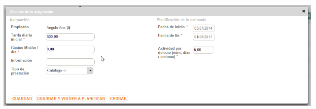 Luego de agregar un recurso a la planificación un popup “Detalles de la asignación” permite registrar las informaciones relacionadas a la intervención del empleado: