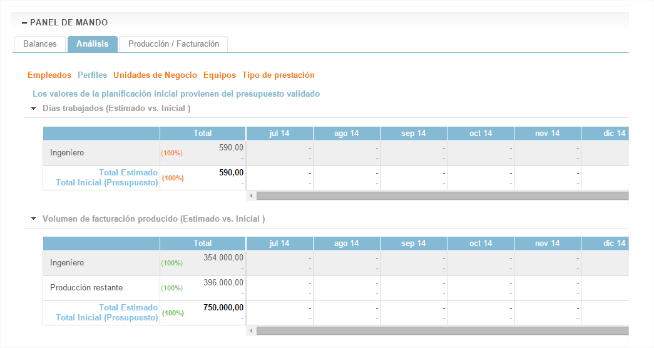 En cada contrato una herramienta “Análisis” permite obtener en tiempo real un comparativo entre la planificación inicial y la planificación estimada.