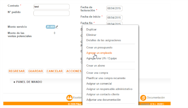- Contrato > menú [Acciones] > “Asignar una UN/Equipo”