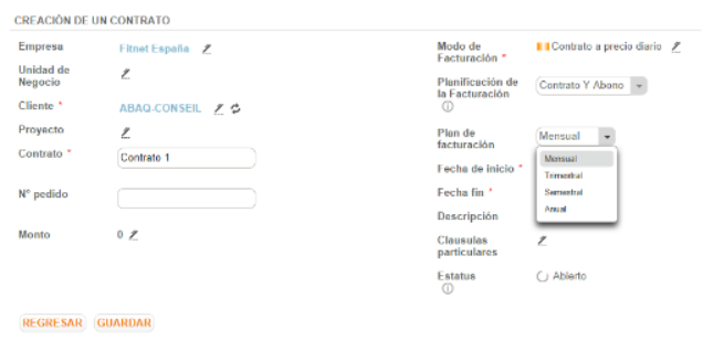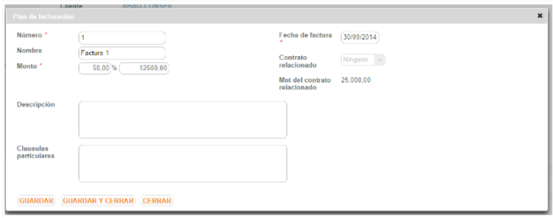 En el modo manual es el usuario quien debe generar la creación y planificación de las fechas de facturas del contrato (cantidad, montos y fechas).