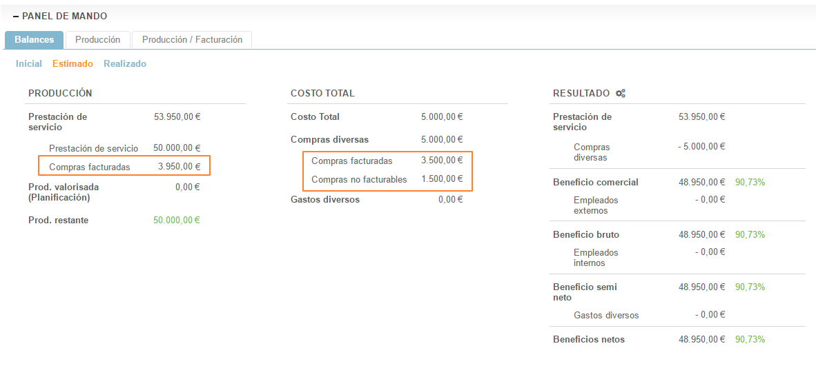 Es normal que el total de las compras facturables sea diferente en el cálculo de la producción y en el cálculo de los costes; el importe de las comisiones se toma en cuenta como producción únicamente.