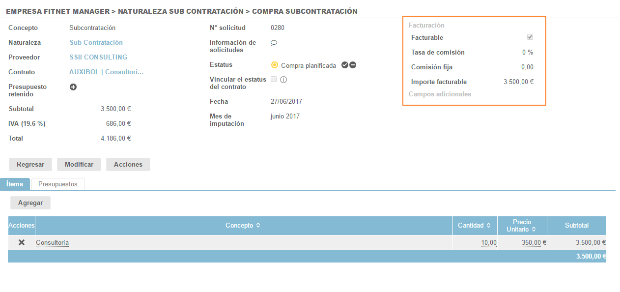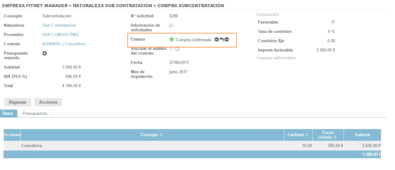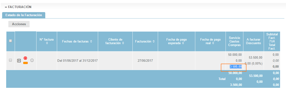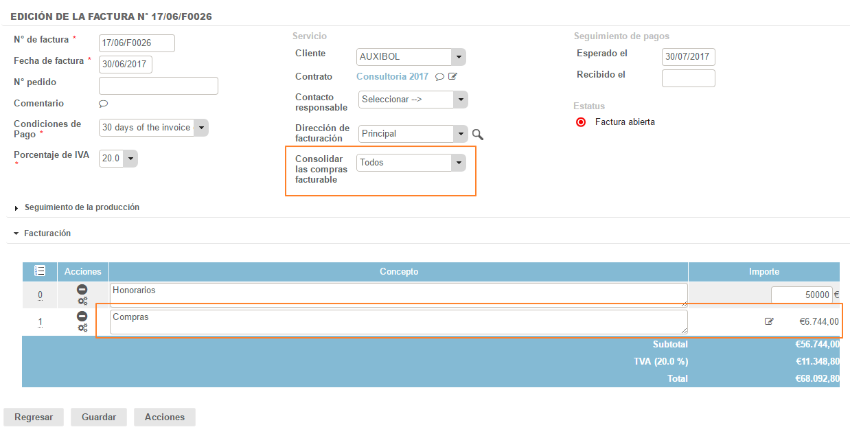 Una vez cumplidas las tres condiciones, el importe de la compra se refleja automáticamente en la proposición de factura.