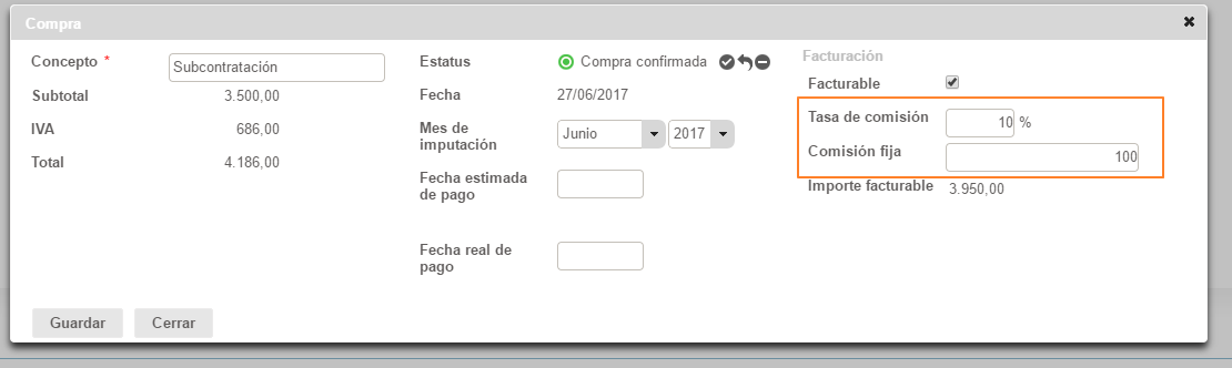 En una compra refacturable, podemos definir también un porcentaje de comisión o un importe fijo de comisión.