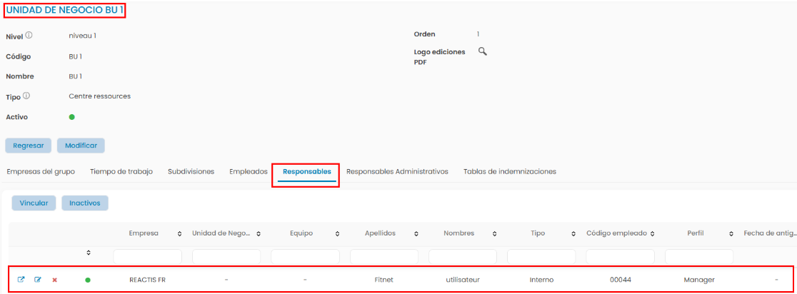 El Responsable de la Unidad de Negocio es un empleado adscrito como responsable de la Unidad de Negocio en la Configuración > Empresas > Unidades de Negocios > Ficha Responsable