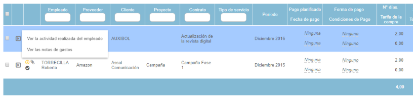 Cada línea proporciona acceso directo a la hoja de actividades, así como a las hoja des gastos para un control óptimo.