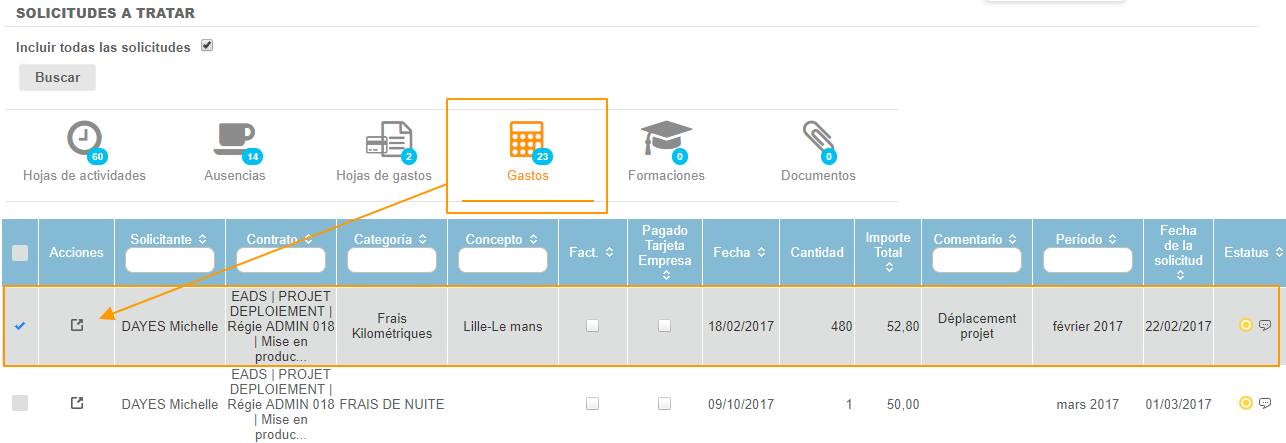 Los empleados designados durante el ciclo de validación para tratar las solicitudes tienen una entrada específica en el menú dentro de su espacio personal Solicitudes: