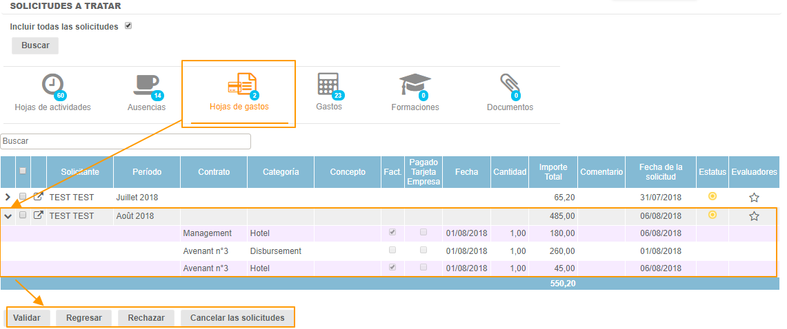 Para validar, regresar, rechazar o cancelar una solicitud de gastos, basta con seleccionar la(s) línea(s) de los gastos y hacer clic en el botón correspondiente en la parte inferior de la página.