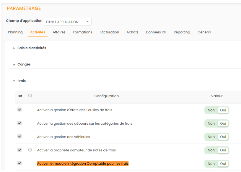 Pour activer l'intégration comptable des FRAIS, rendez-vous dans Paramétrage > onglet Activités > volet Frais