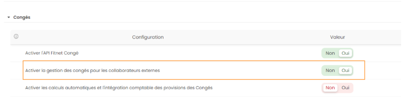 Le paramétrage permet d’activer et désactiver la gestion des congés des collaborateurs externes :