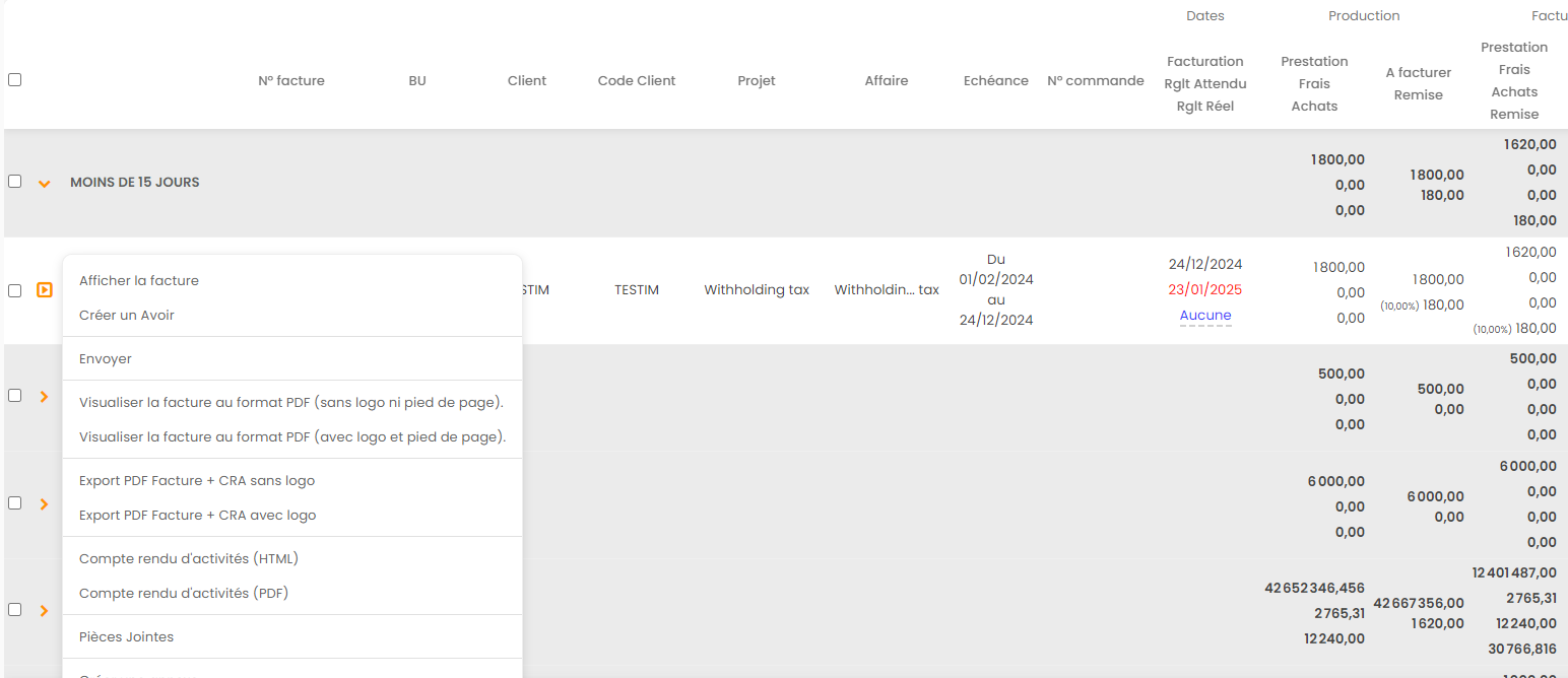 - En choisissant "Règlement attendu" les factures seront triées en fonction du temps écoulé depuis la date de règlement attendu.