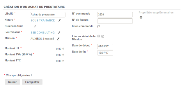 La création d'un achat de prestataire nécessite de remplir des champs obligatoires :