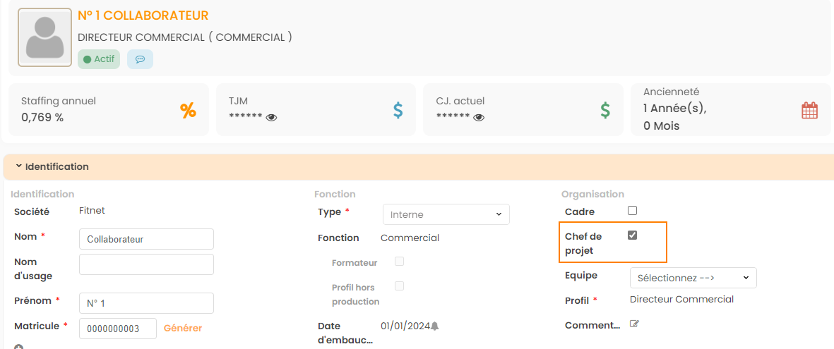 Les collaborateurs ayant la capacité Chef de projet ont une option spéciale lors de leur affectation : le check box “Chef de projet”.