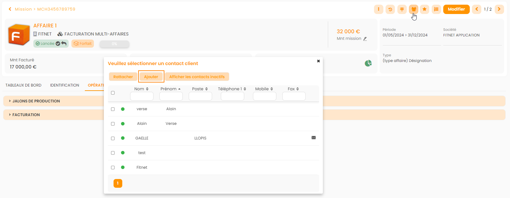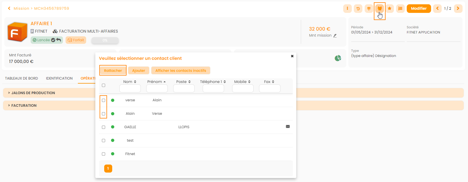 Sur les opportunités ou affaire lancée disponibles dans Affaire-> Missions/Affaires/Phases-> Opportunités ou Missions/Affaires/Phases, il est possible d'affecter un ou plusieurs contacts clients en cliquant sur