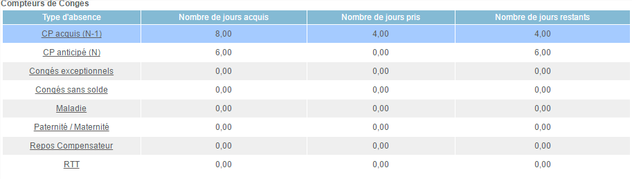 Ce tableau reprend les données des compteurs pour chaque type de congés et d'abscences.