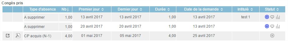 Ce tableau est le détail des congés : Types d'absences, Nombre de jours, Date de début, Date de fin, Durée, Date de la demande, Intitulé et Statut. On y retrouve également les justificatifs .pdf :