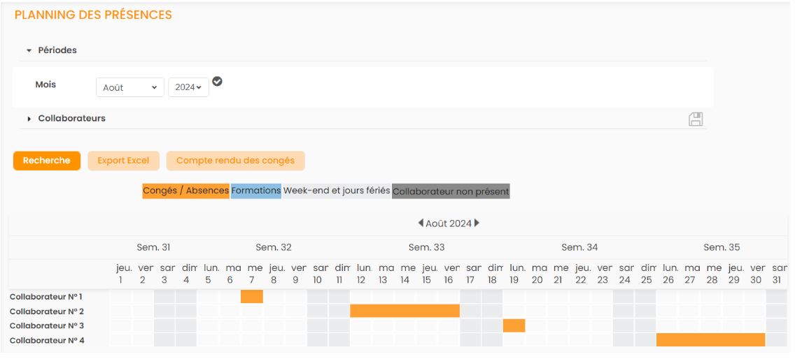 Le Planning des présences donne une vue d'ensemble de type "planning" de toutes les absences des collaborateurs selon un code couleur :