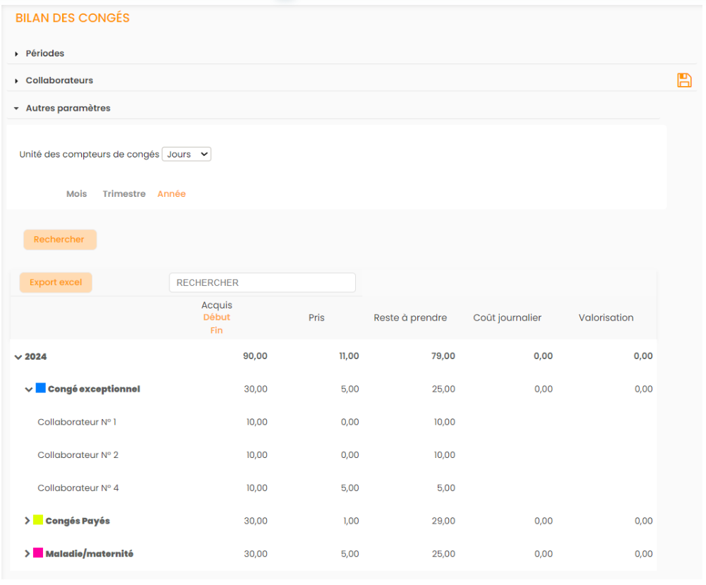 Le Bilan des congés permet de visualiser le détail des jours de congés acquis, pris et restant à prendre par collaborateur, sur une période donnée (mois, trimestre, année).