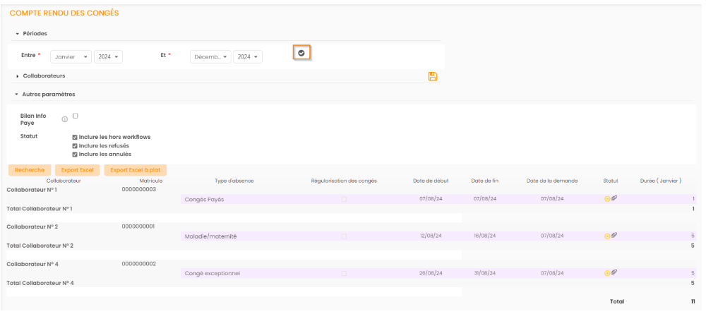 Le Compte-rendu des congés remonte en temps réel toutes les demandes de congés pour la période sélectionnée, quel que soit le statut de la demande : en attente de validation, validée, annulée, ou refusée.