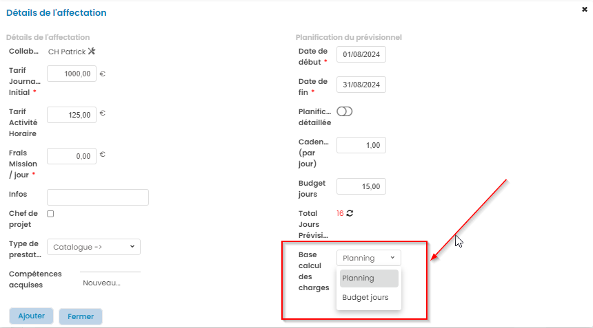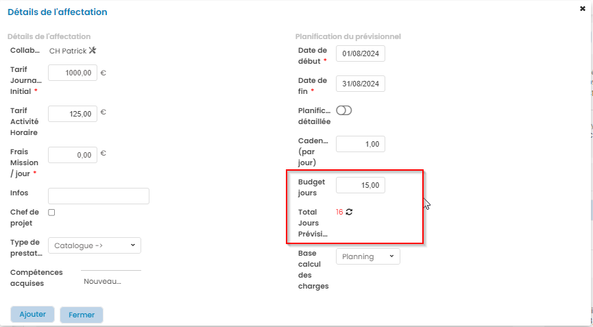 Le budget jours est renseigné lors de l'affectation d'un collaborateur sur l'affaire. Pour vous aider à estimer le budget jours, vous pouvez vous baser sur le Total de jours planifiés, calculé en fonction de la cadence renseignée.