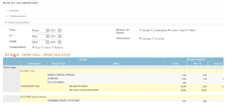 Ce bilan permet d’obtenir pour chaque collaborateur les temps passés sur les activités client et les temps disponibles passés sur des activités hors contrat.