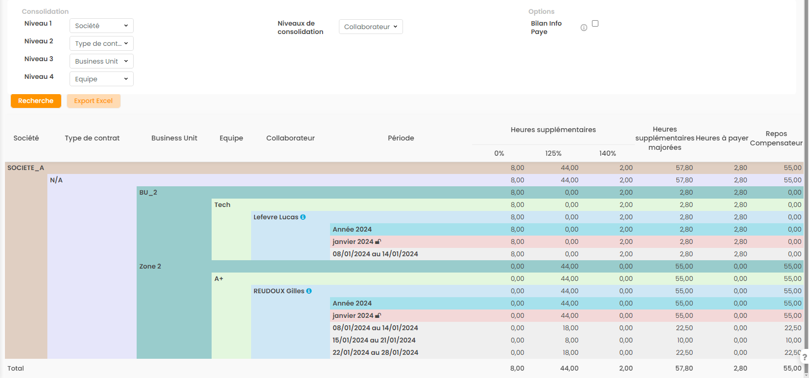 - Consolidation: on peut afficher le niveau le plus bas du filtre, c'est à dire le nom des collaborateurs associés, ou remonter seulement des sommes du dernier niveau de consolidation choisi
