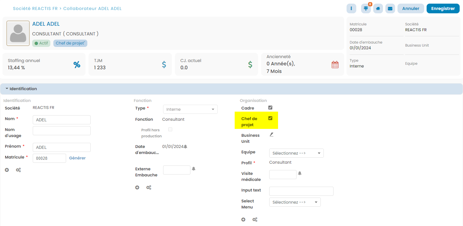 Le chef de projet est un collaborateur avec la case à cocher Chef de projet active dans sa fiche