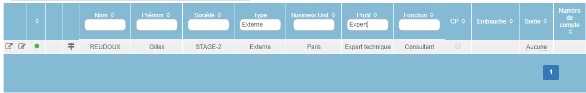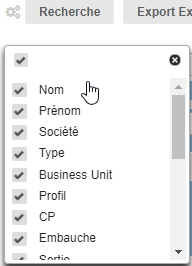 Ces champs sont ceux qui caractérisent le tableau, ils sont renseignés lors de la création/modification d'un collaborateur. Il est donc possible de retrouver un collaborateur si vous renseignez un ou plusieurs de ces champs :