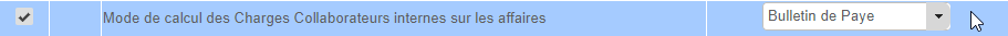 Paramétrage>Affaires>Affaires: Règles de gestion>Mode de calcul des Charges Collaborateurs internes sur les affaires>Bulletin de Paye