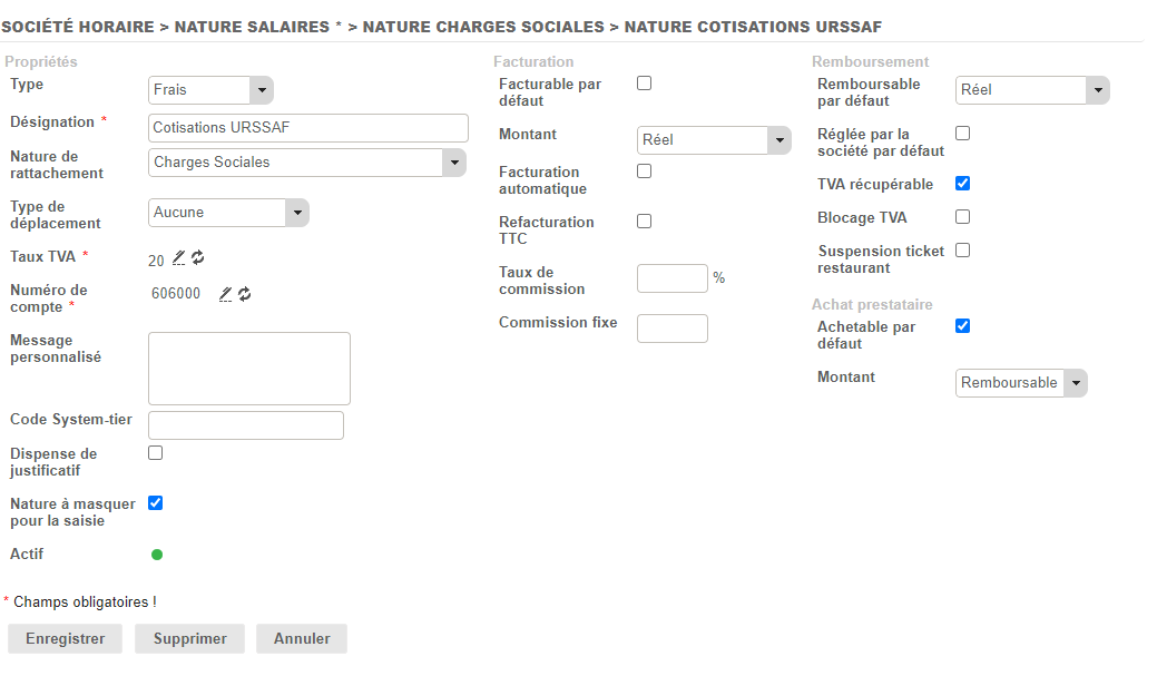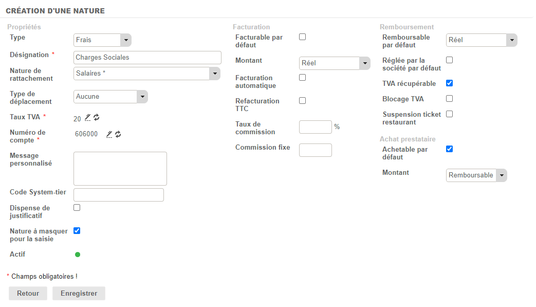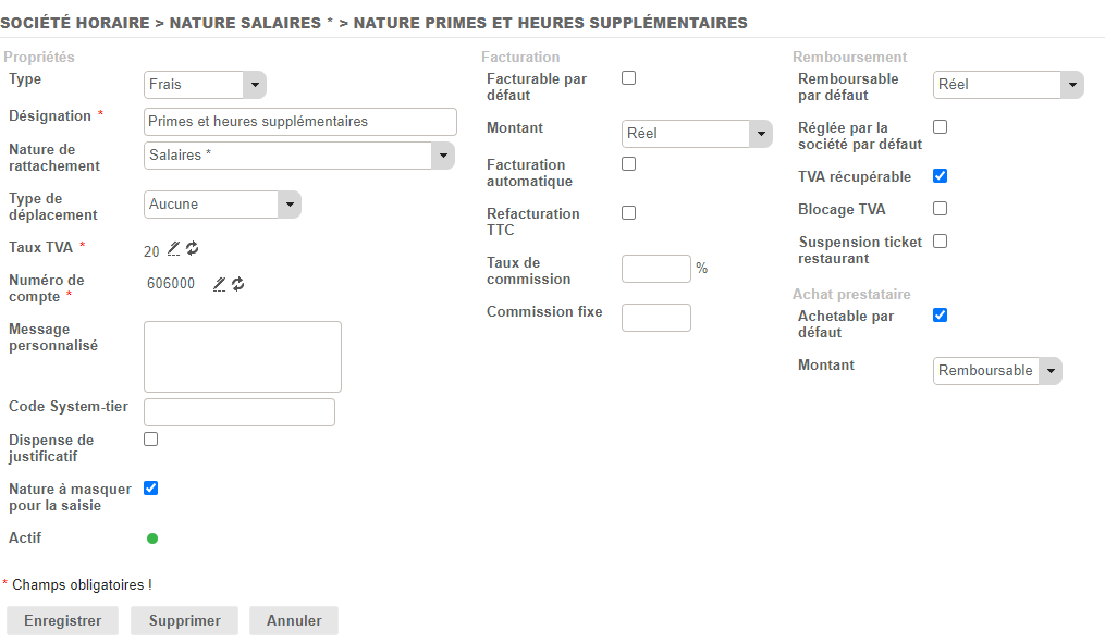 - Il faut bien penser à cocher la checkbox Nature à masquer pour la saisie, afin de ne pas perturber la liste de saisie des collaborateurs