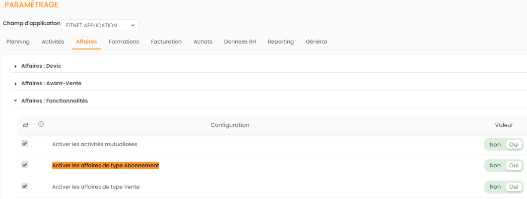 Menu paramétrage > onglet “Affaires” > “Activer les affaires de type Abonnement”