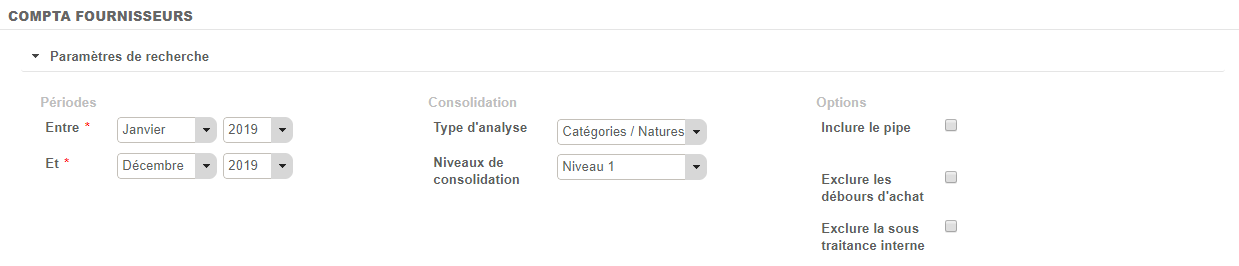 Les paramètres de recherches permettent la consolidation du bilan selon 2 critères :