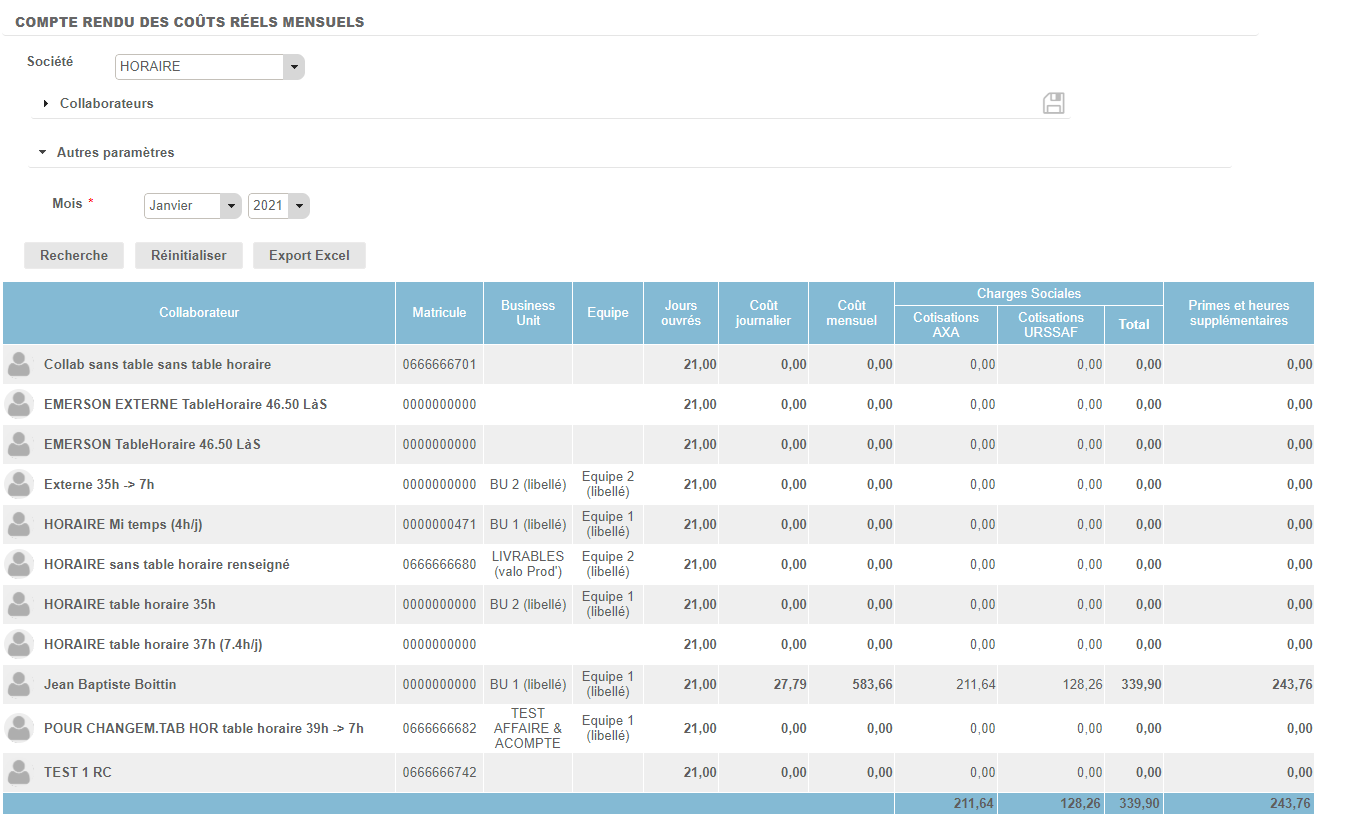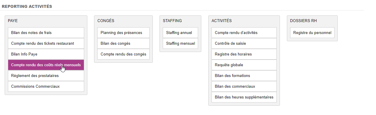 Ce reporting est disponible dans Reporting>Activités>Paye>Compte-rendu des coûts réels mensuels.