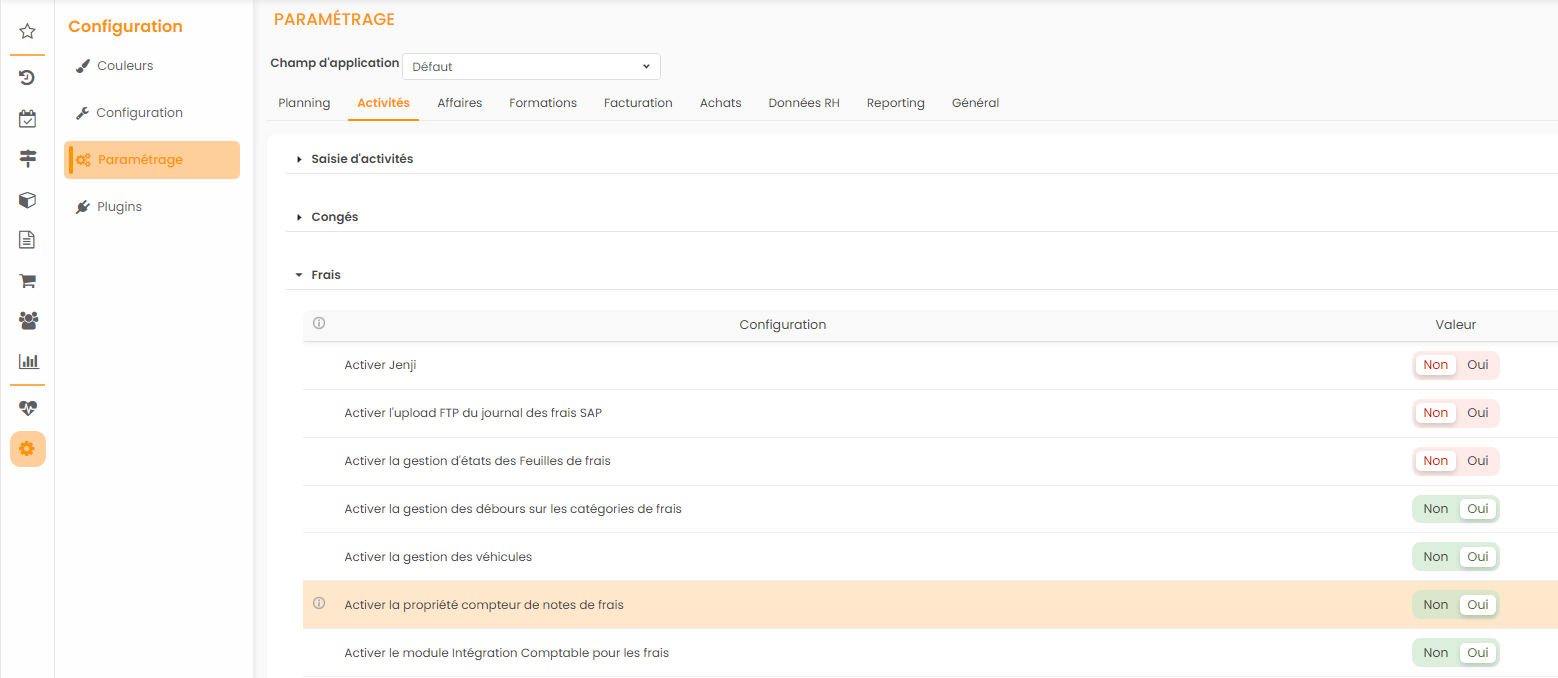 Pour avoir accès aux compteurs des notes de frais, il faut Activer le paramètre dans :