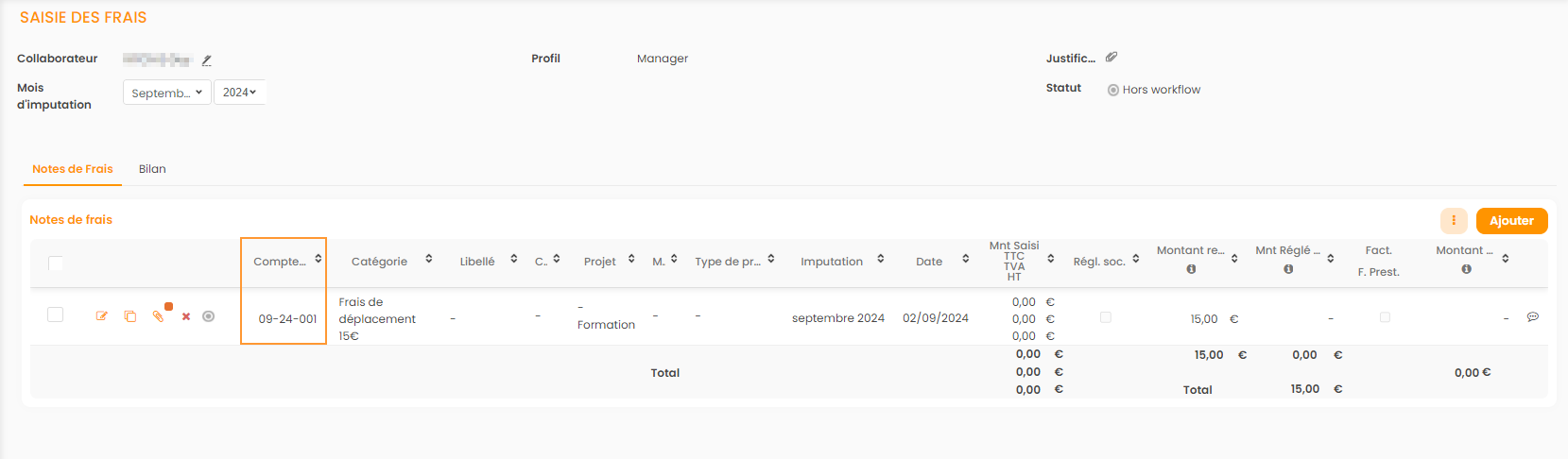 Le compteur permet alors d’identifier et de lier les notes de frais et les justificatifs. Le numéro est généré automatiquement et ne peut pas être modifié, il ne peut pas exister de doublon.