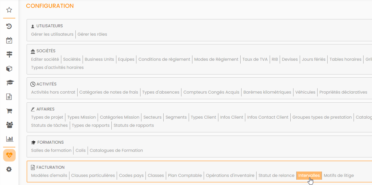 Les intervalles pour regrouper les créances sont paramétrables : Configuration > Facturation > Intervalles