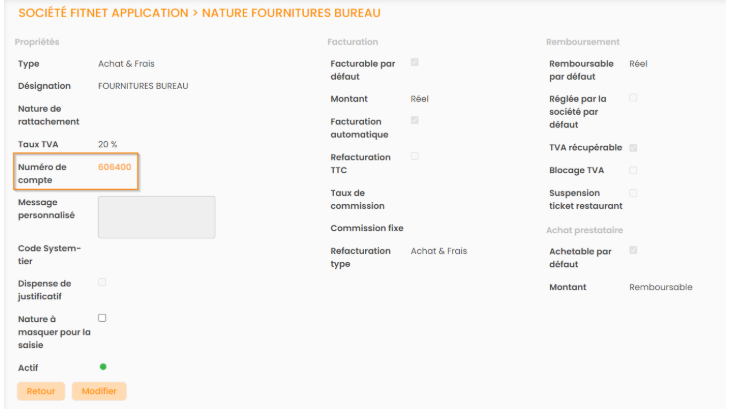 Le rattachement d’une Nature d'achat à un compte peut se faire directement depuis Configuration > section Achat > Natures d'achats > fiche Nature d'achat.