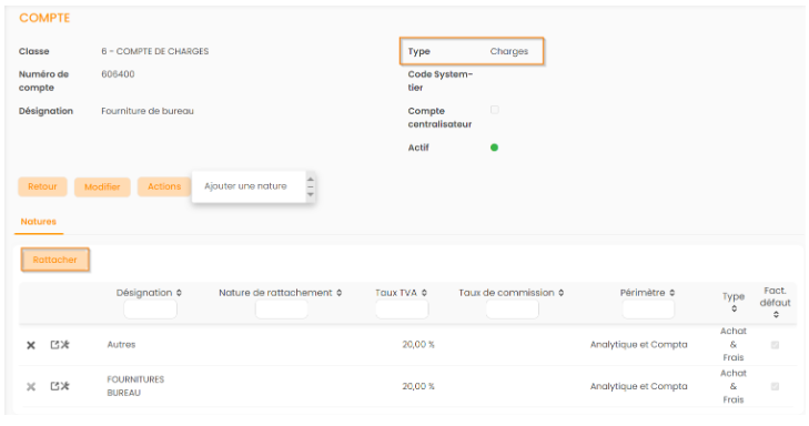 Le Montant HT est ventilé dans une compte de Type “Charge”. Un compte de Type “Charge” permet de rattacher une Nature d’achat.