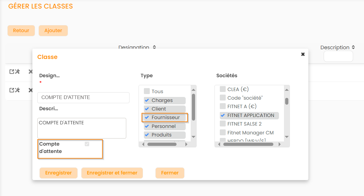Dans Configuration > section Achats > Classes, il est possible de créer une classe d'attente en cochant le champs “Compte d’attente” et en sélectionnant tous les types sur lesquels vous souhaitez créer un compte d'attente (ici Fournisseurs).