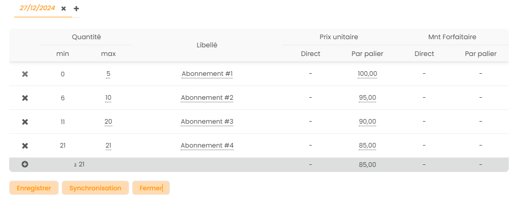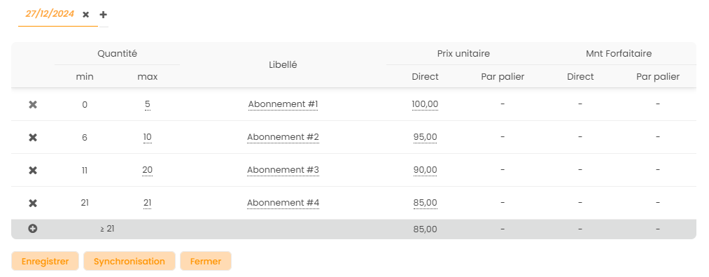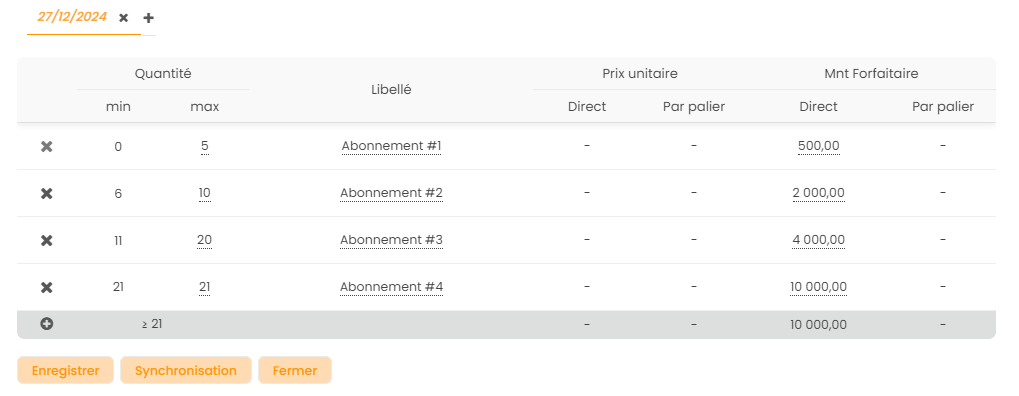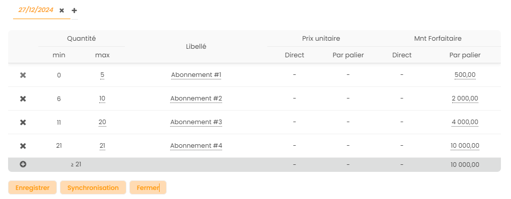 L'ajout et la suppression de tranches se gère grâce aux boutons de la première colonne de la grille tarifaire.