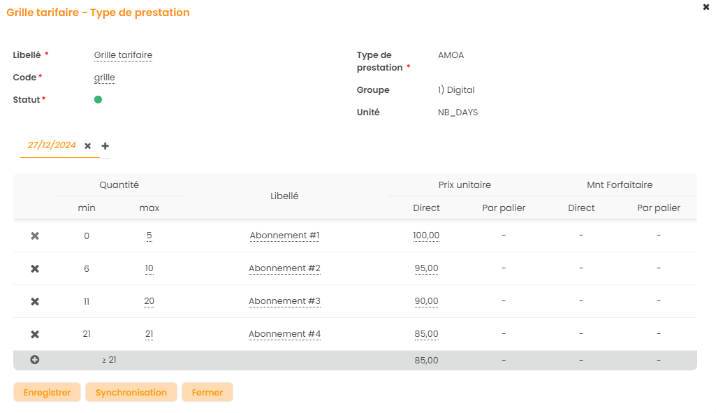 La grille tarifaire se définit par “tranches” qui sont délimitées par une quantité minimale et maximale d’un livrable. Un Montant est à renseigner selon le prix unitaire moyen et le type de facturation souhaité.