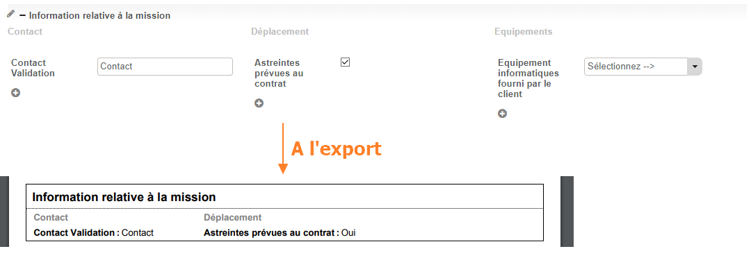 Une fois un volet créé, vous pouvez ajouter des propriétés supplémentaires dans chacune des colonnes. Cela permet de faire figurer toutes les informations nécessaires sur l'export de l'ordre de mission.