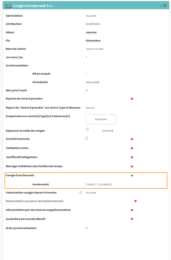 • Ancienneté X Mois / X Année(s) : Nombre de mois ou d'années après la date d'engagement du collaborateur dans l'entreprise où le compteur commence à s'incrémenter.