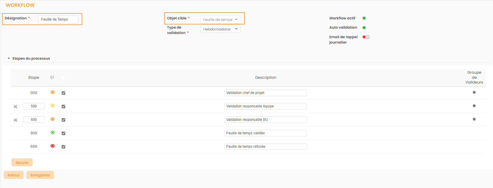 Configurer un workflow sur les Feuilles de Temps
