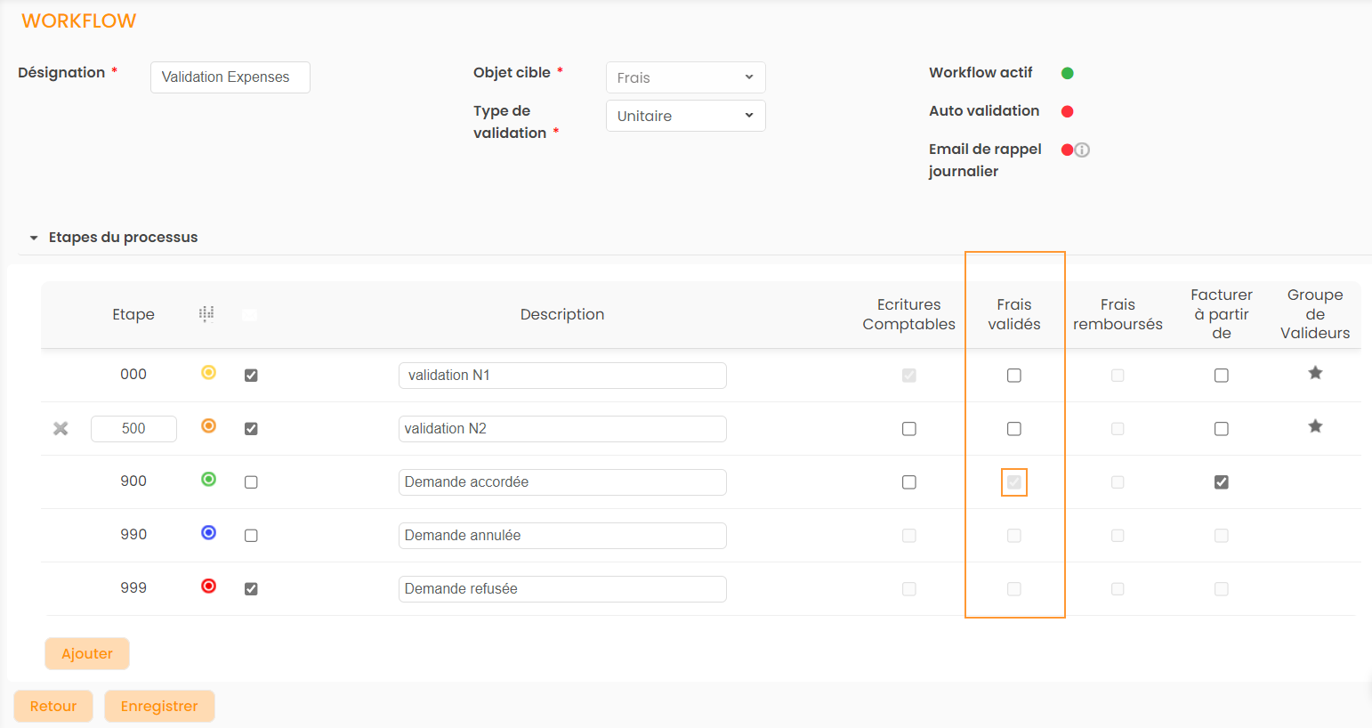 - Cette option "Frais Remboursés" est décochée par défaut dans le workflow.