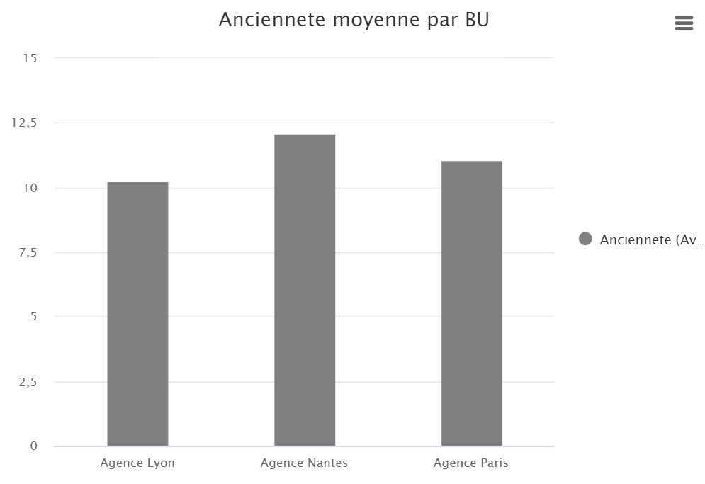 Ce graphique permet de visualiser la répartition de l'ancienneté moyenne des collaborateurs, par Business Unit. La répartition, en année, prend en compte l'ensemble des collaborateurs actifs de la société. Il est possible de visualiser la répartition de l'ancienneté des collaborateurs, par Business Unit selon une période donnée, configurable dans les filtres.