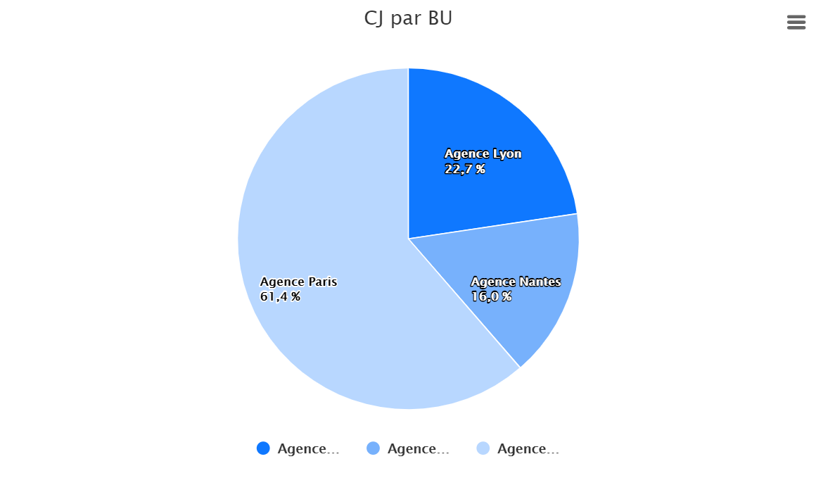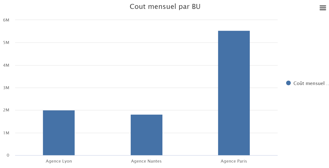 Ce graphique permet de visualiser la répartition du coût mensuel total des collaborateurs, par Business Unit. La répartition, en €, prend en compte l'ensemble des collaborateurs actifs de la société. Il est possible de visualiser la répartition du coût mensuel total des collaborateurs, par Business Unit selon une période donnée, configurable dans les filtres.
