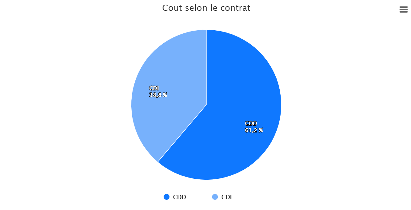 Ce graphique permet de visualiser la répartition du coût journalier travaillé moyen des collaborateurs, par type de contrat de travail. La répartition, en %, reprend la moyenne des coûts journaliers des collaborateurs actifs. Il est possible de visualiser la répartition des coûts journaliers moyens, par type de contrat de travail, selon une période donnée, configurable dans les filtres.